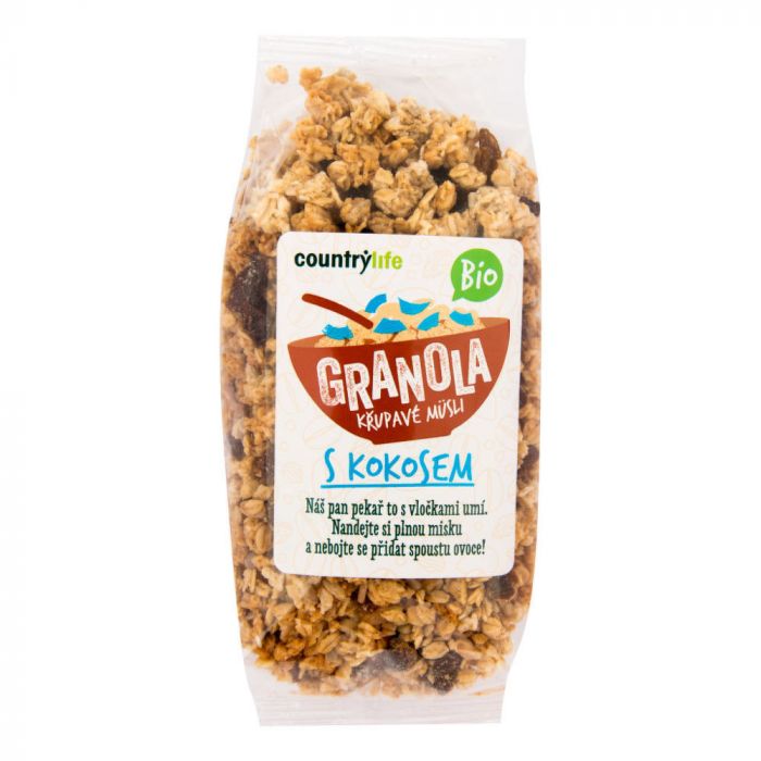 BIO Granola - knuspriges Obstmüsli mit Kokos: HAFERflocken*, gereibte Kokos* (21,8 %), WEIZENsirup*, Rosinen*, Sonnenblumensamen*, Kokosfett*, Weizenvollkornmehl*, Kann Schalenfrüchte enthalten. *Das Produkt von kontrollierten ekologischen Wirtschaft.
