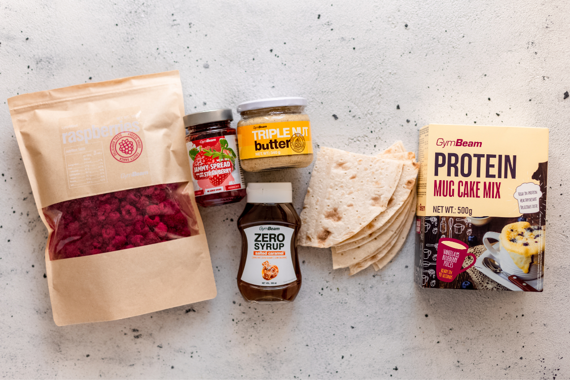 Verrühre in einer Schüssel die Vanille-Tassenkuchen-Mischung, das Ei und die Milch zu einem glatten Teig. Schneide dann die Tortillas in Dreiecke (schneide jede der Tortillas in die Hälfte und halbiere sie dann noch einmal). Bestreiche jeweils ein Stück mit Erdbeeraufstrich, Nussbutter und bestreue es leicht mit gefriergetrockneten Himbeeren.