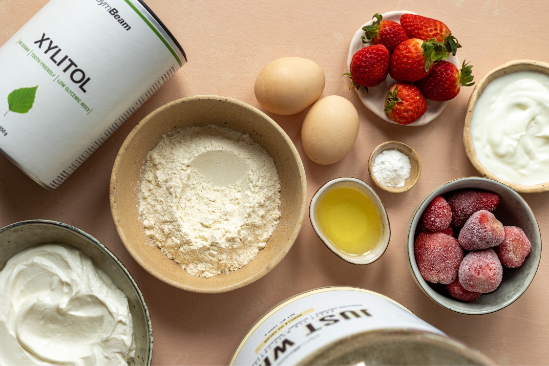 Mehl mit Backpulver, Xylit und Proteinpulver vermischen. Eier, Öl, Joghurt, Vanilleextrakt und Milch hinzufügen und den Teig gut verrühren. Er sollte flüssig sein, aber nicht zu sehr. Eine Silikon-Muffinform oder einzelne Förmchen zu etwa ⅔ mit Teig füllen und in den auf 180 °C. Backe das Ganze etwa 20–25 Minuten lang.