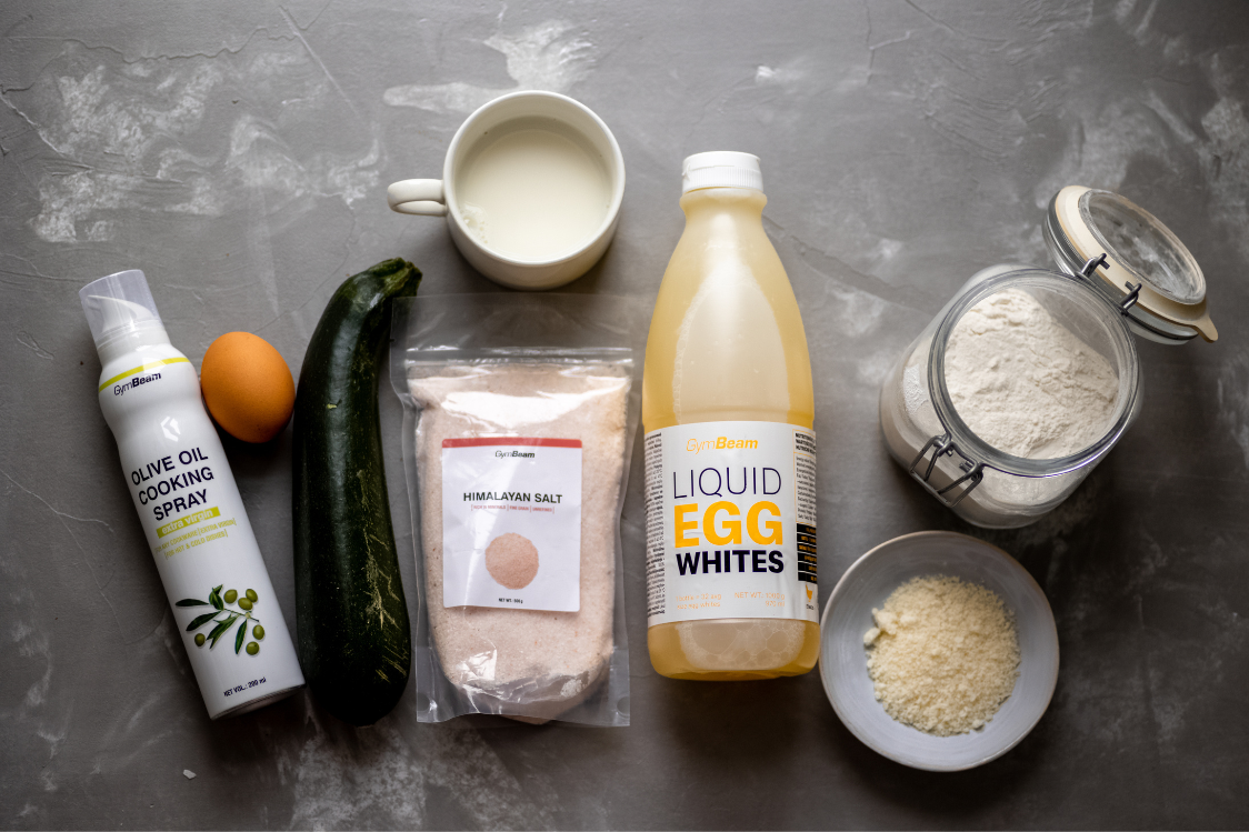 Die Zucchini waschen, reiben und abtropfen lassen (d.h. salzen und 10 Minuten stehen lassen, um überschüssiges Wasser zu entfernen). Dann die Flüssigkeit auspressen und die Zucchini in eine Schüssel geben. Das Ei, Protein, Milch, Parmesan, Mehl, Backpulver, Salz, und schwarzen Pfeffer hinzufügen.