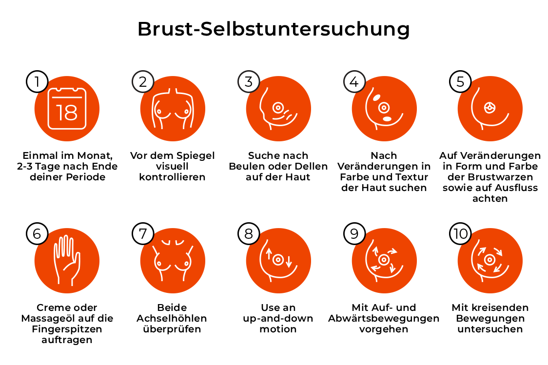 Eine Selbstuntersuchung mag simpel erscheinen, ist aber eine extrem wichtige Methode, mit der du jegliche Veränderungen frühzeitig bemerken kannst. Es wird empfohlen, sie einmal im Monat durchzuführen, idealerweise 2 bis 3 Tage nach dem Ende deiner Periode.