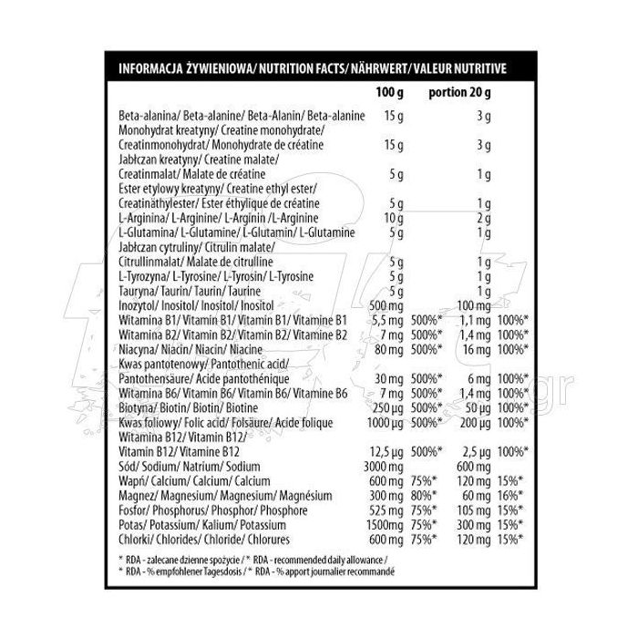 Beta-Alanin, Kreatinmonohydrat, Säureregulatoren: Zitronensäure, Natriumcitrat und Trinatriumcitrat, L-Citrullinmalat, L-Arginin, Kreatinethylester, Kreatinmalat, L-Glutamin, L-Tyrosin, Taurin, Calciumphosphat, Anti- Backmittel: Siliciumdioxid, Kaliumchlorid, Magnesiumcarbonat, Emulgator: Dinatriumdiphosphat, Aromen, Inosit, Süßstoffe: Aspartam und Acesulfam K, Vitamine (Thiaminmononitrat, Riboflavin, Nicotinamid, Calcium-D-Pantothenat, Pyridoxinhydrochlorid, D-Biotin, Folsäure Säure, Cyanocobalamin), Farbstoffe: Chinolingelb - kann Aktivität und Aufmerksamkeit von Kindern beeinträchtigen.