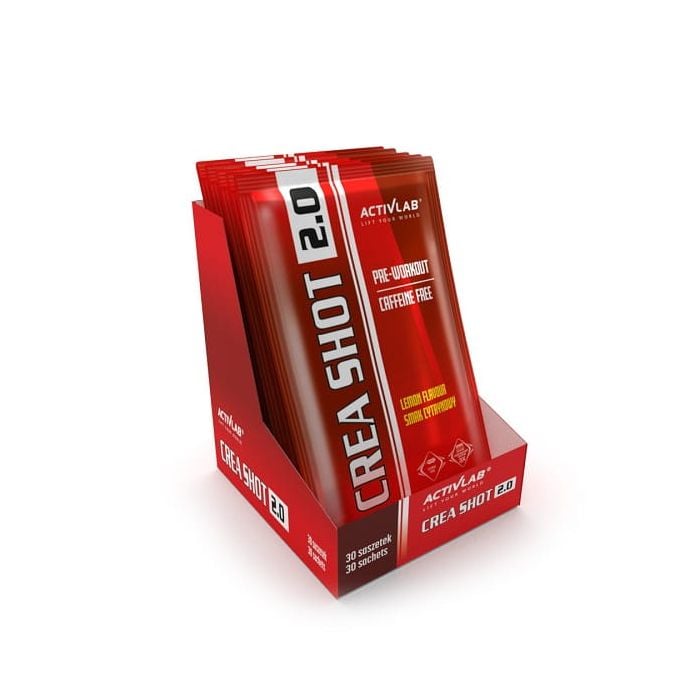 CREA SHOT 2.0 ist eine Vor-Training-Pumpe, die verschiedene Formen von Kreatin, Beta-Alanin, Arginin, Glutamin, Vitaminen der B-Gruppe und Elektrolyten enthält. Jede Dosis enthält eine genaue Kombination von Nährstoffen, die das Volumen der Muskel- und Stickoxid-stimulierenden Wirkstoffe erhöhen. Mit diesem Produkt können Sie viel härter und länger trainieren, bei maximaler Beteiligung am Muskelaufbau. Es eignet sich für den Einsatz vor dem Krafttraining und für die Ausdauer. Es verbessert auch die Erholung nach dem Training. Darüber hinaus enthält die neue Version 2.0 von CreaShot weder Koffein noch andere Stimulanzien.