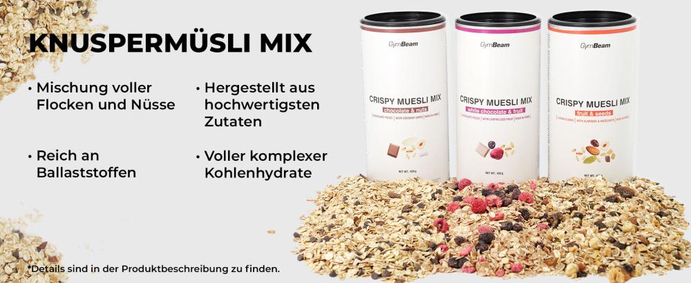 Knuspermüsli Mix ist eine Mischung aus Haferflocken, Obst, Nüssen und anderen knusprigen Zutaten, die hervorragend mit Milch oder Joghurt schmeckt, und du kannst das Produkt auch als Snack genießen. Bei der Herstellung wurden die hochwertigsten Zutaten verwendet, damit du das gute Gefühl hast, deinen Körper mit den nötigen Nährstoffen zu versorgen.