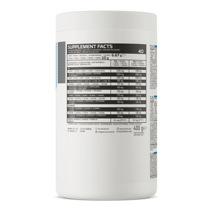 EAA ist eine komplexe Quelle von essentiellen Aminosäuren in Pulverform. Sie sind wichtig für unseren Körper, weil sie an der Produktion von Proteinen beteiligt sind und den Erhalt und das Wachstum der Muskelmasse unterstützen. Sie müssen über die Nahrung aufgenommen oder ergänzt werden, weil der Körper sie nicht selbst herstellen kann. EAAs sind zusätzlich mit L-Glutamin, L-Tyrosin, L-Cystein und Vitamin B6 angereichert. Insgesamt ist es eine Mischung aus 13 Aminosäuren und Vitamin B6. Mit EAA stellst du die Aufnahme von wichtigen Nährstoffen sicher, und außerdem wird dir sein angenehmer Geschmack gefallen.