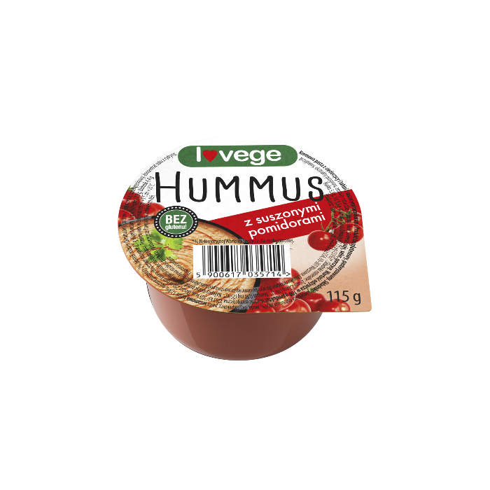 Hummus mit getrockneten Tomaten: Gekochte Kichererbsen 28 %, Wasser, Rapsöl, Tahini- Sesampaste 12 %, getrocknete Tomaten 2 %, Pflanzenfasern (Bambus, Erbsen), Meersalz, Rohrzucker, Zitronensaftkonzentrat, Gewürze, Pfefferextrakte, naturbelassen Aromen, Kurkuma.
