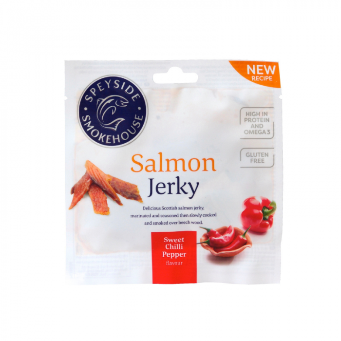 Lachs Jerky ist getrockneter schottischer Lachs, der in mundgerechte Stückchen geschnitten ist. Er zeichnet sich durch einen hohen Gehalt an Proteinen und Omega-3 Fettsäuren aus. Dank der schlichten Kombination aus Gewürzen und Räuchern auf Buchenholz erhält er seinen ausgezeichneten Geschmack. Er ist ein praktischer und gesunder Snack, den du immer dabei haben kannst.