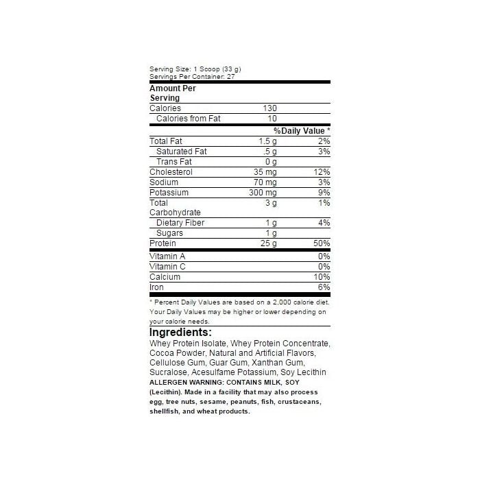 Molkenproteinisolat, Molkenproteinkonzentrat, Kakaopulver, natürliche und künstliche Aromen, Cellulosegummi, Guargummi, Xanthangummi, Sucralose, Acesulfam-Kalium, Sojabohnen-Lecithin.