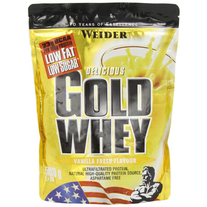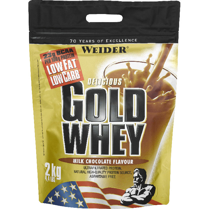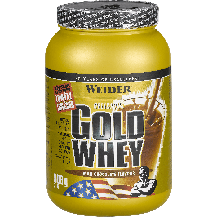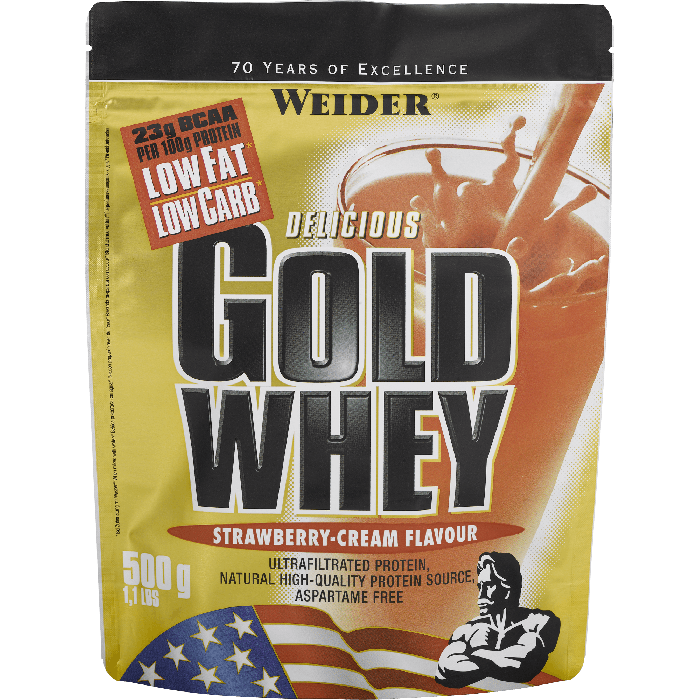 Weider Gold Whey Protein ist hochwertiges Molkenproteinkonzentrat zum maximalen und reinen Muskelaufbau, ohne Fett mit starker anabolischer und antikatabolischer Wirkung. Weider Gold Whey Protein sollte mann ideal am Morgen nach dem Aufwachen, kurz vor und besonders gleich nach dem Training konsumieren. Ist für Betonung der Muskel ideal.