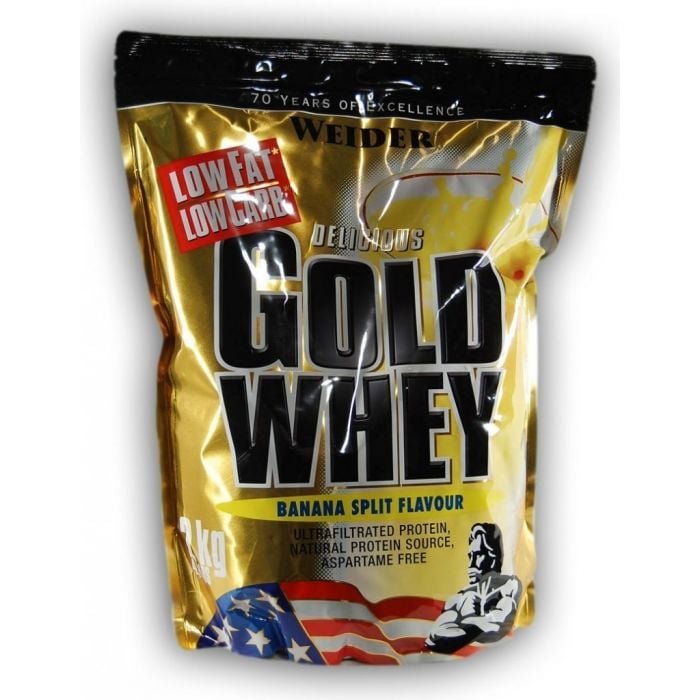 Gold Whey Protein von der Gesellschaft Weider ist ultrafiltriert Molkenproteinkonzentrat, das hoher BCAA Inhalt gewährleistet und - zwar 23 g in 100 g Protein. Dieses 80% Protein - Zucker- und Fettarm, ohne Aspartam, enthält auch bioaktive Bestandteile wie: Beta und Alpha-Lactoglobulin, die Acidität des Organismus reduzieren. Diese Bestandteile gewährleisten bessere Regeneration und Belastungsadaptation, Imunoglobulin verstärkt Abwehrkraft, und Glycomacropeptide beschränken Lust auf Essen.
