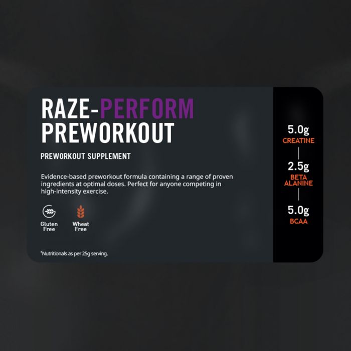 Raze-Perform™ Pre-Workout mit Koffein kann vor jedem Kraft- oder Ausdauertraining zuverlässig auftanken. Es enthält außerdem Beta-Alanin, Citrullin-Malat und Kreatin-Monohydrat, um die Leistung während kurzer Trainingsintervalle zu steigern .