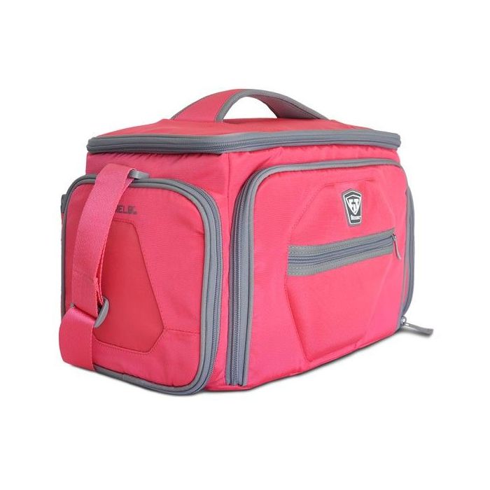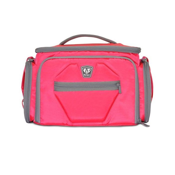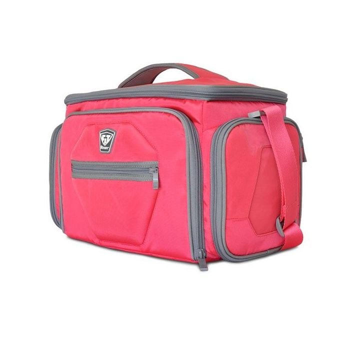 Sporttasche The Shield LG Pink in pink mit schönem Design, innovativen Eigenschaften und hochwertigem Material. Es ist leicht, tragbar und aus starkem Polyester-Nylon gefertigt. Es enthält, 5 große Boxen für Hauptnahrungsmittel, 2 Kühlgels, einen Spender für Vitamine, Nahrungsergänzungsmittel und Proteingetränke, 2 intelligente Flaschentaschen, Proteinriegel und Obst. Hält Ihre Lebensmittel bis zu 8 Stunden frisch.