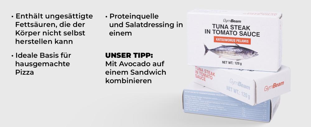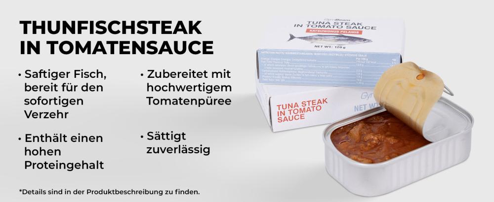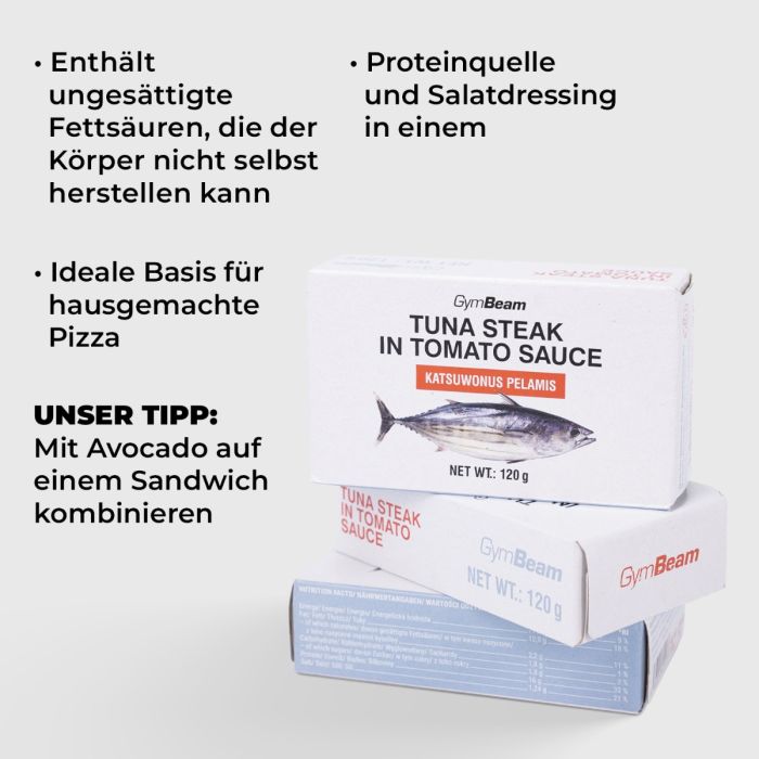 Thunfischsteak in Tomatensauce ist ein saftiges Stück des beliebten Meeresfisches in Dosen. Kombiniert mit hochwertigem Tomatenmark, wird es dich mit seinem vollen und ausgewogenen Geschmack überzeugen. Mit ihm lässt sich im Handumdrehen ein tolles Hauptgericht oder einen Snack zubereiten. Gleichzeitig verfügt es über einen hohen Eiweißgehalt, der zum Wachstum und zur Erhaltung der Muskelmasse, sowie zur Erhaltung der normalen Knochengesundheit beiträgt. Er zeichnet sich auch durch einen hohen Anteil an gesunden Fetten in Form von ungesättigten Fettsäuren aus. Diese tragen zur Aufrechterhaltung eines optimalen Cholesterinspiegels im Blut bei, wenn gesättigte Fettsäuren in der Ernährung durch sie ersetzt werden.