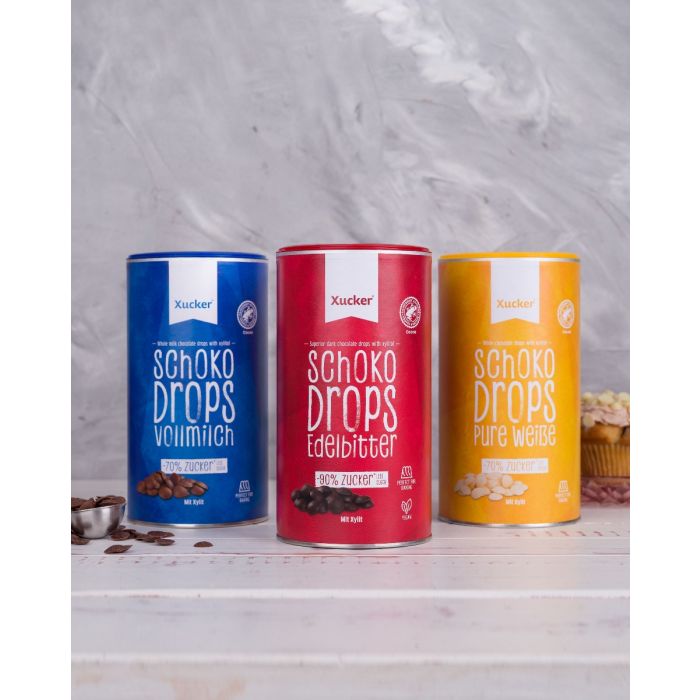 Die Drops aus Vollmilchschokolade sind Stückchen aus Vollmilchschokolade ohne Zuckerzusatz, die nur mit Xylit gesüßt sind. Xylit ist ein natürlicher Süßstoff, der sich durch niedrigen glykämischen Index und etwa die Hälfte des Kalorienindexes im Vergleich zu normalem Zucker auszeichnet. Die Schokostückchen sind ideal zum Backen von Keksen, Muffins und Kuchen, zur Herstellung von Schoko-Toppings und selbstgemachtem Müsli, aber sie eignen sich auch zum Aromatisieren von Porridge oder Joghurt.