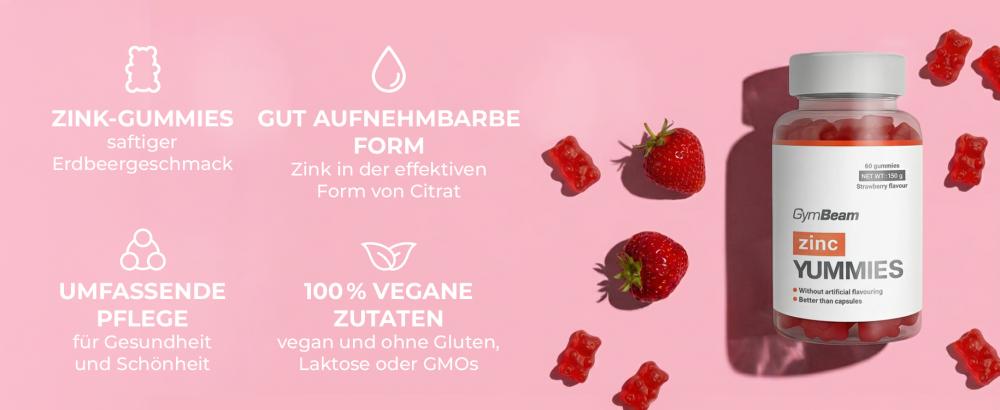 Zinc Yummies sind köstliche, erdbeeraromatisierte Gummis, die das Immunsystem sowie die richtige kognitive Funktion unterstützen