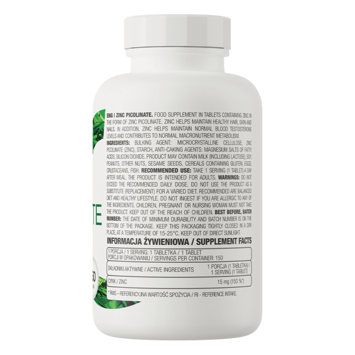 Zinkpicolinat sind kleine Tabletten, die Zink in Form von Picolinat enthalten, das in seiner Absorption außergewöhnlich ist. Zink ist für den Menschen wichtig für das reibungslose Funktionieren mehrerer Prozesse. Im Körper trägt es zur Fruchtbarkeit und Fortpflanzungsfunktion bei, hält den richtigen Testosteronspiegel aufrecht, spielt aber auch eine Rolle bei der Zellteilung und der ordnungsgemäßen DNA-Synthese. Zink unterstützt auch das reibungslose Funktionieren des Immunsystems und den Schutz vor oxidativem Stress. Es hilft beim Stoffwechsel von Makronährstoffen, Säuren und Basen, Fettsäuren oder Vitamin A. Unter anderem ist es nützlich für die kognitive Funktion, die Proteinsynthese und die Erhaltung gesunder Knochen, Haare, Nägel, Haut und gutes Sehvermögen. Die kleine Tablettenform ist vorteilhaft für Menschen, die Schwierigkeiten beim Schlucken von Tabletten haben. Sie erhalten 15 mg Zink in jeder Dosis.